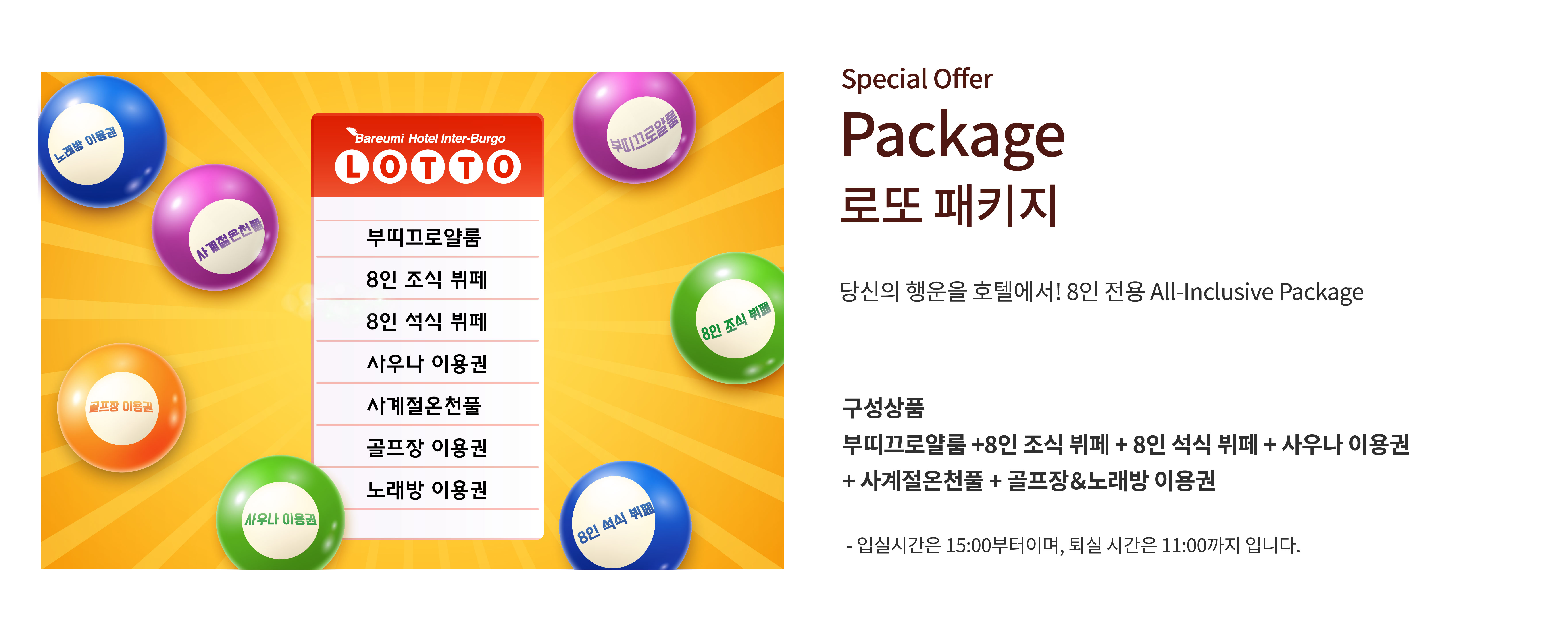패키지 가격 판매가 주중 : 990,000원(최대 8인기준, VAT 포함) 주말(금,토) 및 공휴일 전일 성수기 : 1,190,000원(최대 8인기준, VAT 포함) (예약일 기준으로 적용 됩니다.) 패키지 구성 부띠끄로얄룸 + 8인 조식 뷔페 + 8인 석식 뷔페 + 사우나 이용권 + 사계절온천풀 + 골프장&노래방 이용권 1. 부띠끄로얄룸 2.호텔 조식 8인 맛있는 조식뷔페로 행복한 하루를 열어 보세요. *조식뷔페 이용시간(07:00~10:00, Last entry time 9:30) 3. 8인 석식 뷔페 기억에 남을 저녁을 완성하세요. *더뷔페 석식 영업시간(주중 - 18:00~21:00, 토요일/공휴일 - 1부17:00~19:00, 2부19:30~21:30, 일요일 - 18:00~21:00) 4.사우나 + 사계절 온천풀 8인 모두가 함께하는 즐거운 시간, 특별한 추억을 만드세요. *사우나 이용시간(주중 - 06:00~22:00, 주말/공휴일-06:00~21:30, 14세 미만은 입장이 불가합니다.) (매월 첫째주 일요일 휴관, 설/추석 당일 15시 오픈) *사계절 온천풀 영업시간(1부-09:00~11:40(160분), 2부-12:30~15:10(160분), 3부-15:30~18:10(160분), 4부-18:30~21:10(160분)) (매월 첫째주 월요일 휴관, 설/추석 당일 휴관) 5. 골프장&노래방 이용권(각 2시간) - 노래방 이용시간 : 체크인 당일 15:00~23:00(미성년자는 입장이 불가합니다.) - 골프존 이용시간 : 체크인 당일 15:00~23:00(14세 미만은 입장이 불가합니다.) *노래방, 골프존은 이용 하시기 전 파크빌리지 낮잔에밤별소 직원에게 예약 후 이용하시기 바라며, 영업장 예약 상황에 따라 이용 시간이 조정될 수 있습니다.(053-602-7212 / 내선212) *추가 특전 안내 - 피트니스 센터 & 실내 수영장 50% 할인 - 치맥 50% 할인(치킨4세트, 생맥주 8잔 한정) 이용안내 - 본 상품은 당일 예약이 불가하며, 최대 이용 인원은 8명 입니다. -더뷔페 석식 이용시간(요청 사항에 석식 예약시간 메모 필수) 예약하기 취소 및 환불 규정 - 투숙 30일전까지 위약금 없음 - 투숙 29일 부터 16일 전까지 총 금액(지불보증)의 50% 위약금 부과 - 투숙 15일 전부터 당일까지 총 금액(지불보증)의 100% 위약금 부과 전화문의 : 053-602-7173 |