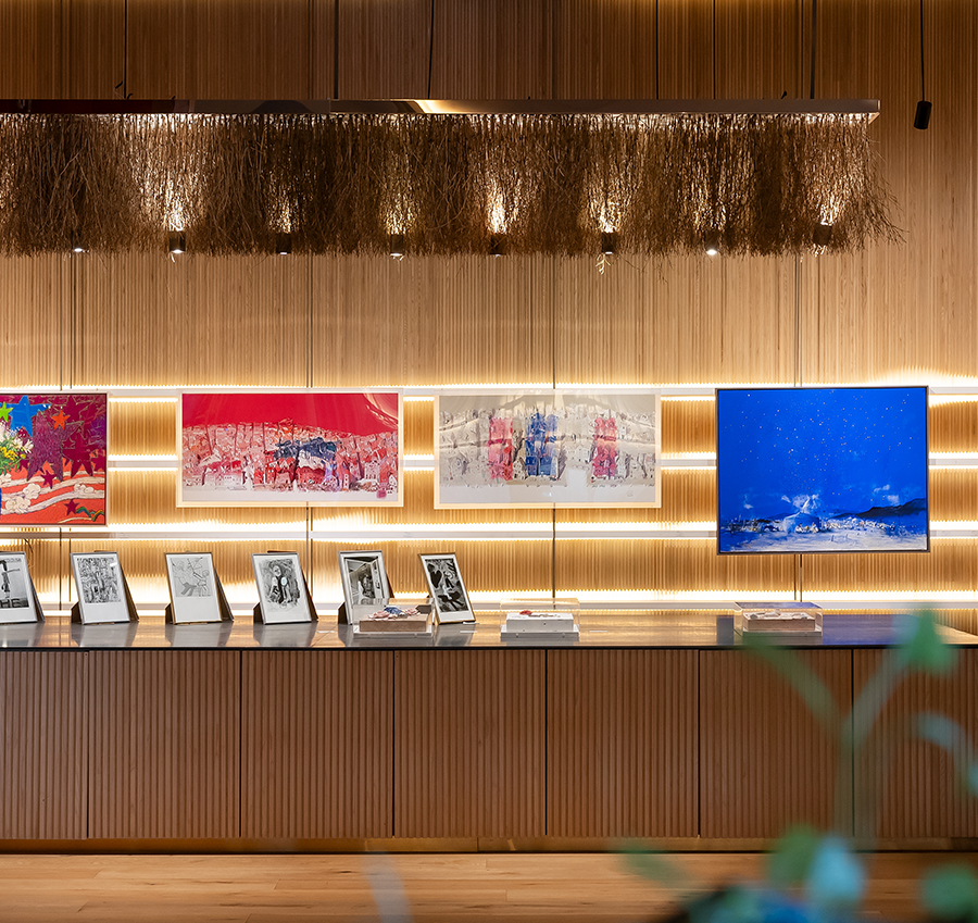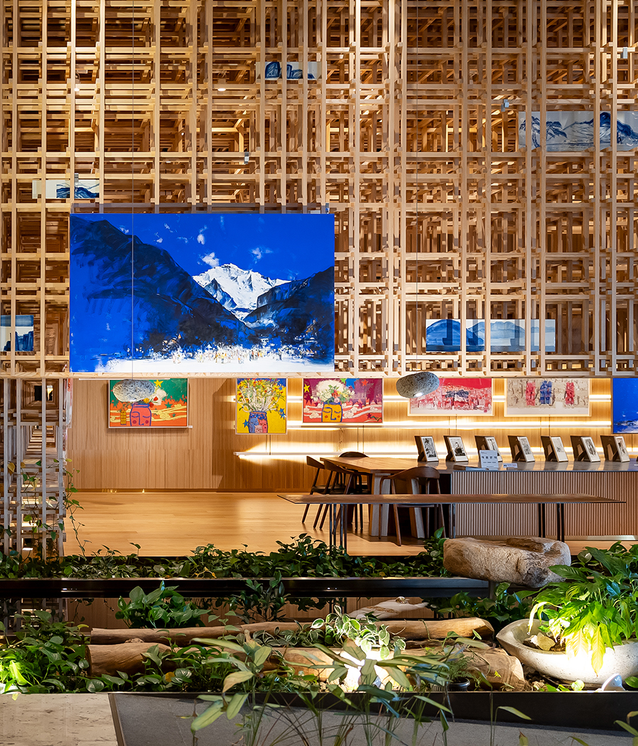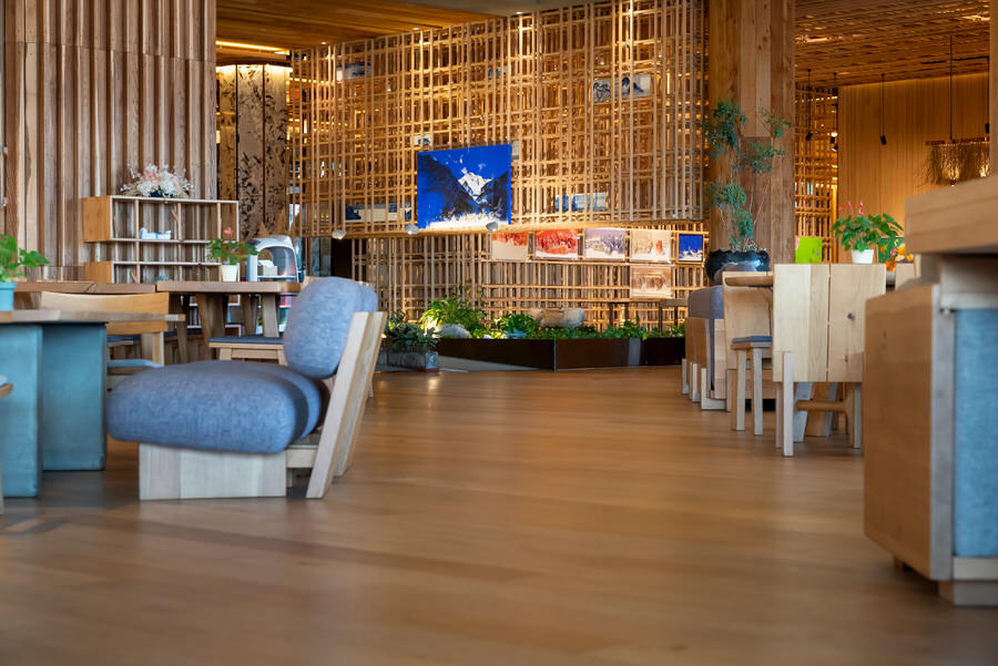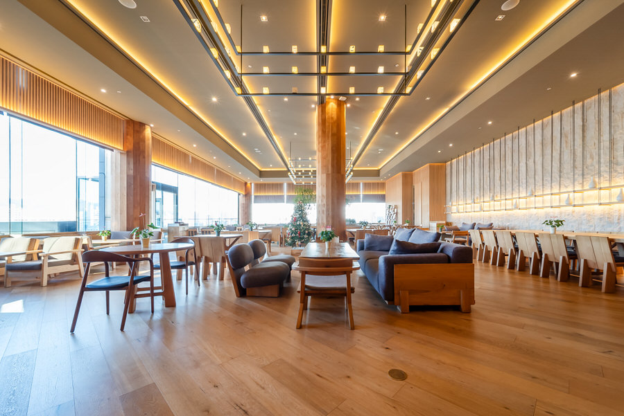 a lobby lounge with picturesque views
